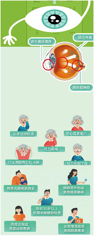据悉,青光眼的患病机理,主要是因为眼内房水循环障碍,导致房水排除受阻,打破了眼内房水循环的动态平衡,从而引起眼压升高、损害视神经。孙嬿说:“青光眼的发生,与遗传因素、眼球发育问题、生活习惯、用眼卫生、外伤、眼部及全身的相关疾病有一定关系。”