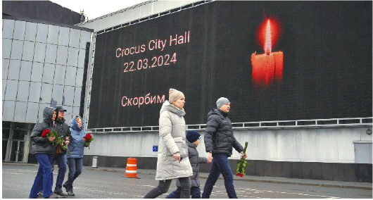 3月24日在俄罗斯莫斯科近郊恐袭事件现场附近拍摄的悼念遇难者的显示屏。 新华社发