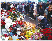 23日,在俄罗斯莫斯科近郊,人们在恐袭事件发生地附近悼念遇难者。 新华社发