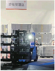 编号为6的电池车间厂房的卷帘门偶尔会打开,透过工厂外墙的栏杆望进去,可以看到里面有戴着白色安全帽、身穿橙色反光马甲的工作人员,正在紧锣密鼓地进行着作业。有叉车装载着货物持续进出电池车间,不时有货车停在电池车间门口,并在装卸完成后驶出工厂。