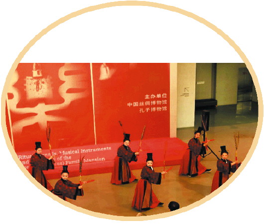 孔子博物馆礼乐传习所(箫韶乐团)在“孔府旧藏礼乐服饰文物特展”开幕式上表演。