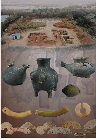 磨盘山遗址出土的陶器、石器、玉器,都可与周边地区进行对比研究。马家浜文化时期的平底釜和扁足或锥形足折腹鼎、牛鼻耳罐、红衣陶豆等,崧泽文化时期的浅盘豆形杯和带把鼎,少量的多孔石刀,小型的三足器、带把器和分体式玉璜……诸多与周边区域“同款”的文物,提示广泛存在着文化交流,表明古国时代的第一阶段——崧泽文化圈可能在马家浜文化晚期已经开启了。