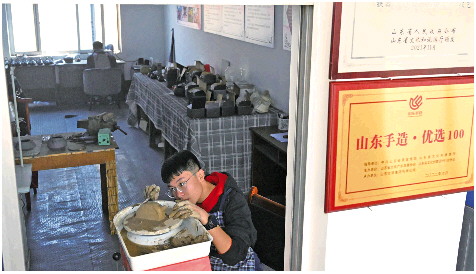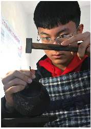 淄博市淄川区龙泉路旁的一处制作间里,不时传出叮当叮当的敲打声,寻着声音走进房间,一个少年正用锤头錾刻着一把铁壶。他略显稚嫩的眼神中透出自信,錾头在他手中不断调整着角度,设计思路也逐渐展现出来。他就是淄博市新元中学初三学生戚祖豪。
