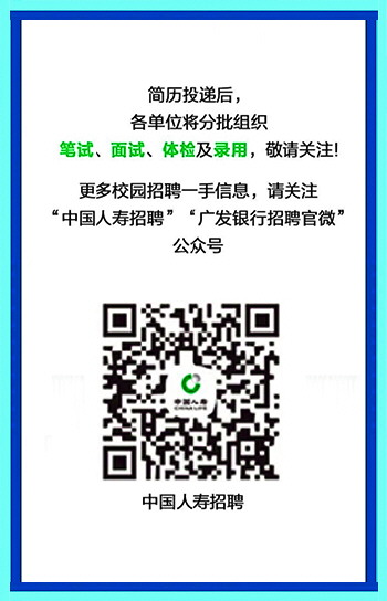 报名方式:扫描二维码→关注“中国人寿招聘”官微→选择我要应聘→校园招聘→工作地点选择“山东济宁”→选择职位报名即可。
