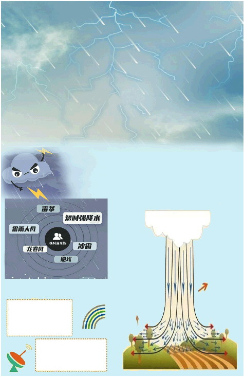 强对流出现时,往往乌云密布、电闪雷鸣、风大雨急,甚至伴有冰雹。