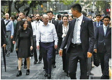 德国总理朔尔茨(左二)一行在重庆解放碑漫步。 据中新社