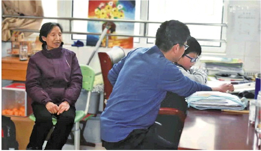 孙金元在办公室辅导学生,妈妈在一旁看着面带微笑。