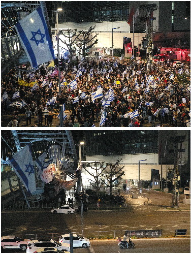 4月13日晚,在以色列特拉维夫的以色列国防部前,民众在安全警告生效前举行示威集会;下图:4月13日晚,在以色列特拉维夫的以色列国防部前参加示威集会的民众在安全警告生效后散去。 新华社发