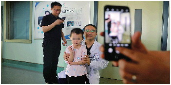 家长给成功手术后的患儿和主治医生宁岩松拍照留念。