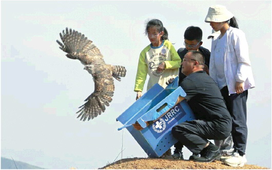 图为济南翱翔猛禽救助中心负责人胡海磊(中)和前来进行研学的孩子们放飞伤愈的苍鹰。 受访者供图