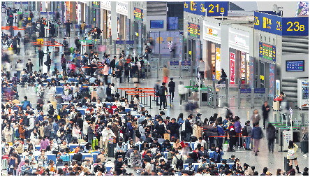 ◥五一假期首日,各地迎来旅客出行高峰。图为旅客在上海虹桥火车站候车。