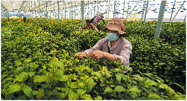 在日照市岚山区巨峰镇,茶农正在现代化茶叶种植大棚内采茶。 刘涛 摄