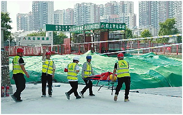 随后,许商综合片区(七期)棚改旧改E区项目施工单位山东高速德建集团有限公司组织开展了预防高处坠落应急演练活动。演练模拟了建筑工地发生高处坠落事故,项目部立即启动了事故应急救援预案,各工作小组按总指挥命令立即展开工作,相关救援人员迅速赶往现场立即开展初步救援,及时叫停周边作业和对事故现场进行警戒隔离,拨打120急救电话,并向上级及县住建局报告。在各方的共同努力下,“伤员”得到初步救治后,被及时送往县医院。整个演练过程有条不紊,各小组协调配合、明确职责范围,展现了良好的应急处置能力和协同配合水平,达到了预期效果。
