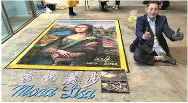 从兰桂和他在街头仿画的《蒙娜丽莎》。 受访者供图