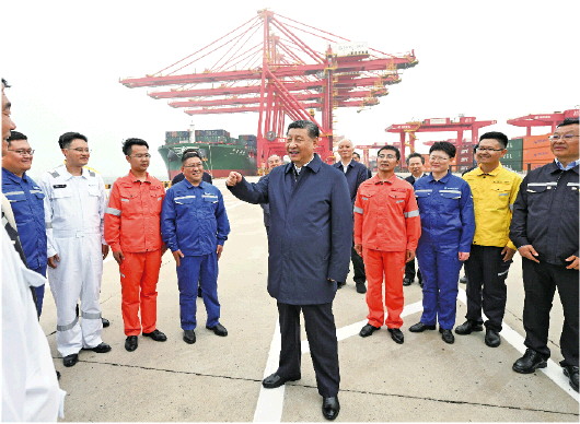 5月22日至24日,中共中央总书记、国家主席、中央军委主席习近平在山东考察。这是22日下午,习近平在日照港亲切慰问港口科技工作者、运营人员、航运人员。 新华社发