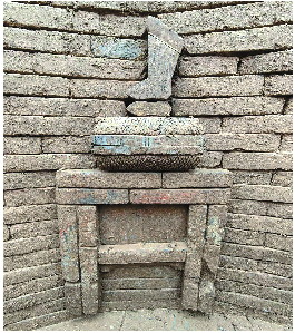 把这些疑惑暂放一边,遇到了遗迹就先按操作规程清理。转过天来的一上午时间,人骨四周的淤土也清理差不多了,因怕铁锹伤及东壁的砖仿木结构,故意多留了一截淤土,要用手铲、竹签慢慢剔,这一剔不要紧,这些砖雕器物一件一件都出来了,衣架、箱柜、方几……都出奇地精致。有意思的是箱柜上嵌了一个砖仿藤编或蒲编的方盒,一条条植物的纹理都表现得清清楚楚。新奇的是,方盒顶上还嵌了两只砖雕靴子,一只侧放,靴底施黄彩,一只正放,鞋帮施黑彩。更奇特的是,靴子北面的方几上,用砖立体雕刻了三件器物——粉盒、行炉、碗,粉盒施红彩,行炉施白地,画黑花,碗施白彩。完全是模仿真实的瓷器形制,仅比实物略小,而且每件器物后部都有榫,嵌入墓壁中,完全是有意设计好的。我的头一下“大”了。靴子的形象,我印象中河北中部几个地区曾经出土过,但用砖雕刻成的立体器物,我前所未见。