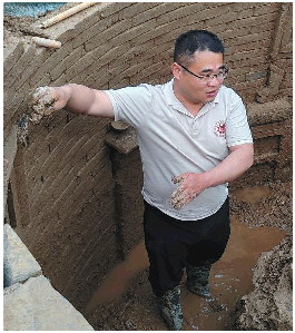 我骑上电动车向西北区驰去,在松软的田埂上,车轮带的黄土飞扬如同腾云驾雾。到了探方边,他们正在露砖的地方刮面,东西向一道横墙,这种熟悉的迹象让我脱口而出:“这应该是砖室墓墓门的顶部,墓门前面应该有墓道,后面应该是墓室。”已近中午,我先安排他们加班把围挡扎完,下午继续向前、向后刮面。