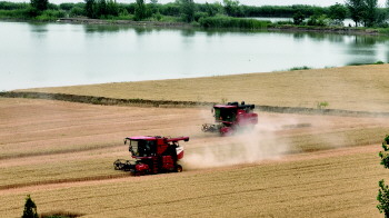 麦浪翻金光,丰收又在望。金黄的小麦诉说着丰收的喜悦,在石桥镇登丰里社区夏收现场,只见金黄的小麦已被收得差不多,两台巨大的小麦收割机正轰鸣着全速收割,扬起漫天的秸秆碎屑,几辆蓝色的卡车就停在现场等待装载,石桥镇处处展现着乡村振兴的新希望。