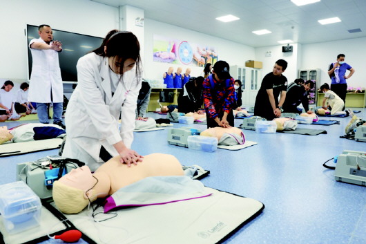 图为2023年5月21日走进山东第一医科大学时,学生们在老师的指导下体验“心肺复苏”。