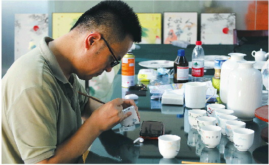 银凤陶瓷的设计师正在杯身上作画。