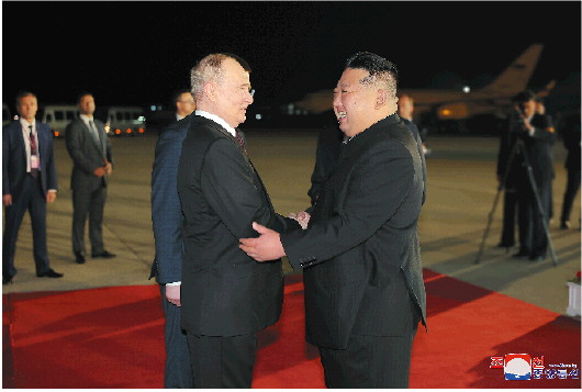 6月19日,朝鲜劳动党总书记、国务委员长金正恩(前右)在平壤国际机场迎接俄罗斯总统普京到访。 新华社/朝中社