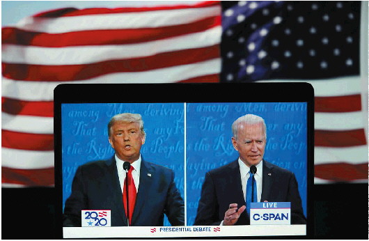 这是2020年大选前特朗普(左)与拜登参加最后一场总统候选人电视辩论的视频画面。(资料图) 新华社发