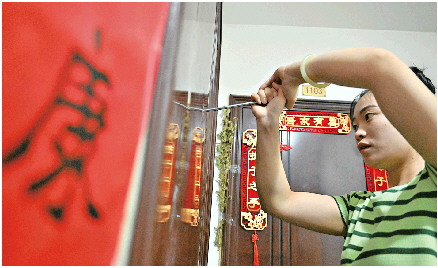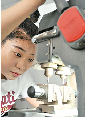 张晴用钥匙机为顾客的钥匙刻齿。