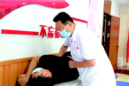 义诊现场,业达医院党委书记姜立新为居民进行检查。