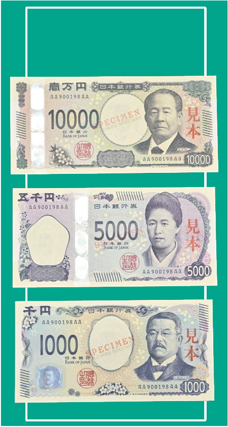新版10000日元、5000日元、1000日元纸币上的人物肖像分别是企业家涩泽荣一、教育家津田梅子和医学家北里柴三郎。现在流通的10000日元、5000日元、1000日元纸币上的肖像分别是教育家福泽谕吉、女作家樋口一叶和生物学家野口英世。