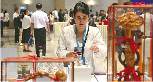 7月10日,第十届尼山世界文明论坛在曲阜尼山开幕。来自海内外的各界嘉宾齐聚孔子故里,共话传统文化与现代文明。图为外宾在论坛展览区参观山东手造精品。 图据中新社