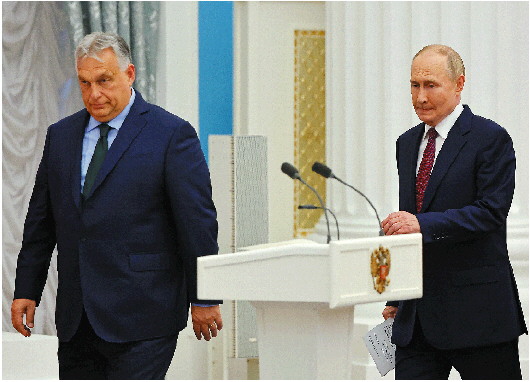 7月5日,在俄罗斯首都莫斯科,俄罗斯总统普京(右)与匈牙利总理欧尔班在会谈结束后举行联合记者会。 新华/路透