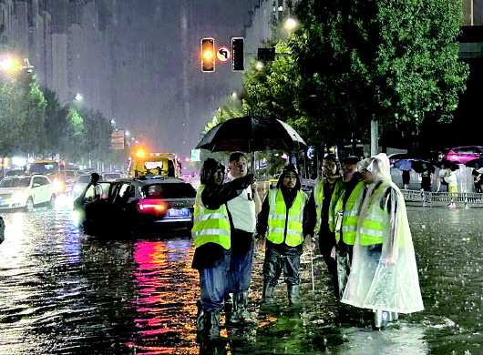 在城区主要路段,无论是交通疏导、隐患排查,还是险情处置、群众救助,随处都能看到水务集团应急抢险队员忙碌的身影。面对被树枝、树叶、垃圾堵塞的排水口,他们不畏艰难,密切配合,清理排水障碍,确保排水系统高效运行。他们时而化身“清理工”,手持铁锹、撬杠,一铲一铲地清理着阻碍物;时而化身“推车侠”,帮助受困车辆脱离困境。