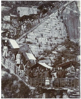马安,1863年至1865年任英国驻沪领事,后任烟台芝罘区领事。在其《山东游记》中写道:“我们上山的路上穿梭着成百上千的上山和下山的朝圣客们,他们来自全国各地。无数的乞丐们立在路两旁乞求朝圣客们的施舍。这些可怜的人们住在路边的洞穴里。”另据1855年来华的英国传教士、泰山研究学者韦廉臣所撰写的《华北、满洲里、东蒙之旅》的说法:登泰山这条路上最大的困扰是随处可见的各个年龄段的男女乞丐,如果不把那些不幸的人向旁边挪开,我们就没法行进。