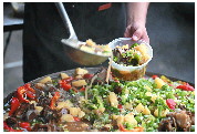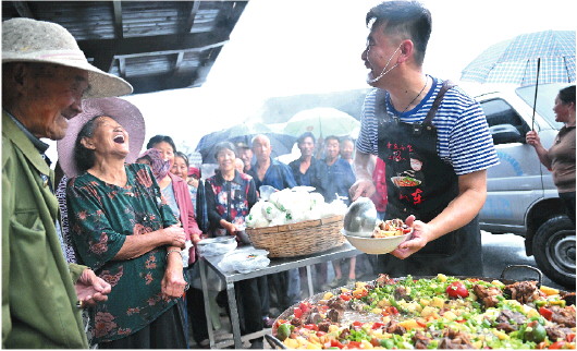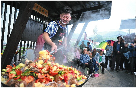 五花肉炖冬瓜、油菜粉条炖鸡、红烧肉炸丸子炖白菜、西葫芦豆腐炖肉……有了第一次的经验,吕有彬越做越熟练,菜谱也是不重样。他每天上午购置食材,中午驱车赶往村里,下午点火开炖,基本上傍晚五六点就能开饭。如今吕有彬已经跑了三十五个村子了,做过的大锅菜也是多种多样。虽然每做一顿大锅菜都很费时费力,而且这些食材都是吕有彬自掏腰包,但是他却越干越起劲儿。“在我自己能力范围内做一点有意义的事情,感觉浑身有使不完的劲儿!”吕有彬笑着说。