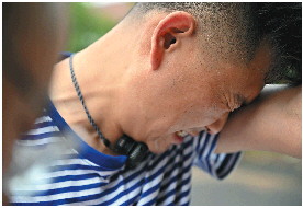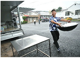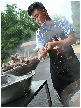 小雨天还算凉快,但是忙碌做饭的吕有彬热得满头大汗。