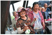 吕有彬正在给老人们打饭,吃到免费大锅菜的老人们笑开了花。