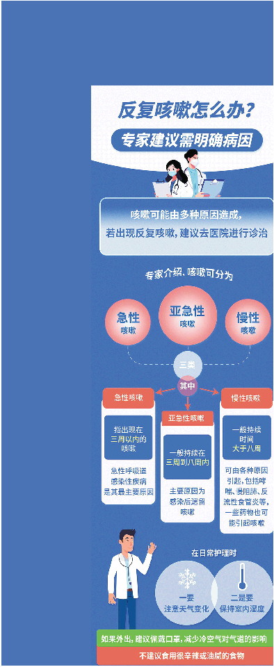 樊青介绍,咳嗽是一种正常呼吸道保护性生理反射,当呼吸道黏膜发生炎症或受异物、刺激性气体等刺激时,分泌物会增加,可通过咳嗽这一动作将分泌物排出体外。它也是某些疾病的症状之一,最常见于呼吸道感染性疾病,也可见于非呼吸道感染性疾病和全身性疾病。