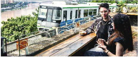 7月12日,外国留学生在重庆新晋景点“三层马路”打卡。 新华社发