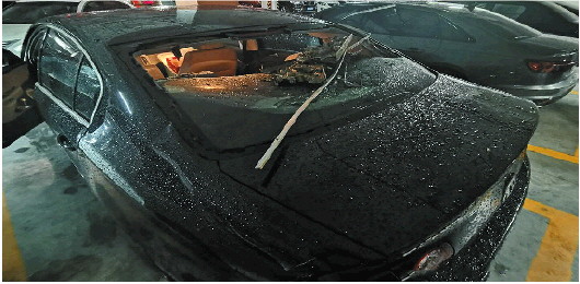 晚8点半左右,聚会结束后,郑先生驾车回家,刚停好车就发现车的后挡风玻璃碎了,车上还遗留一大块“肇事”的建筑构件。“应该是在酒店停车场被砸的,当天雨下得挺大,风也挺大,可能是楼顶的建筑构件被风刮掉后砸到了我的车,晚上视线不是很好,所以开车走的时候也没发现。”郑先生说。