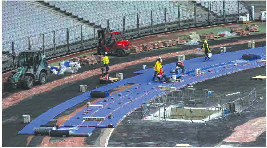 工人们铺设法兰西体育场内的紫色跑道。