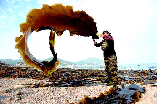 工人将海带甩到半空,再铺在鹅卵石上晾晒。