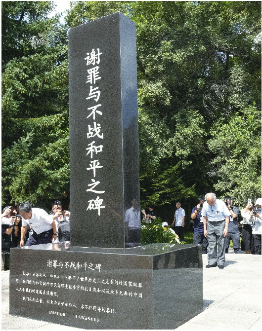 ◤8月13日,侵华日军第七三一部队“少年队”原队员清水英男在侵华日军“731部队”旧址“谢罪与不战和平之碑”前忏悔谢罪。