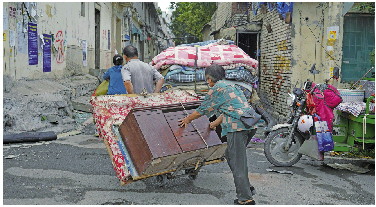最多的是搬家公司。货拉拉的车一辆接一辆,停在一座座房子、商铺门口,人们接力把东西运到车上。找了多年都没找着的画册、压在箱底的结婚证、孩子上学的第一张奖状……尘封的记忆随着旧物呼啸而来,又随着搬家车缓缓驶去。