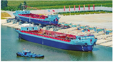 京杭运河首批两艘新能源智能商品船在济宁邹城顺利下水。