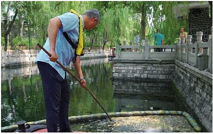 “刚开始的时候,水面清理的效果很差。”最初,水面上的落叶和垃圾的清理基本仅靠人工打捞,“一天来来回回不知道要清理多少遍,但看不出效果,水面还是不干净。”