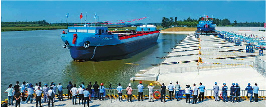 京杭运河首批新能源智能商品船在济宁下水引来重量级围观。 杨国庆 摄