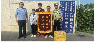 8月16日,孩子父母来到中队,赠送一面锦旗,感谢民警救助。 (通讯员 俎青青)
