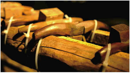 首先,工具类:锯、刨、锛、锉、凿、钻、铲、曲尺、墨斗。因为鲁班最早是木匠,所以先发明了一些木工工具。后来被“金、银、铜、铁、锡、石、编、雕、瓦、漆……”九佬十八匠三百六十行拿去用,就成了工匠们的通用工具。这些工具当中,功用最大者应该首推墨斗。平常讲“以事实为准绳”,准绳就是墨斗里能扯出来的这根线。老一代工匠管墨斗叫“班靴”,这不单是指它的造型像只靴子,言外之意是教人穿上鲁班的鞋,规规矩矩地走路。