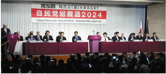 9月12日,日本自民党总裁选举候选人在东京永田町的党总部参加发表政见的演讲会。