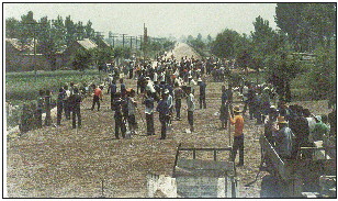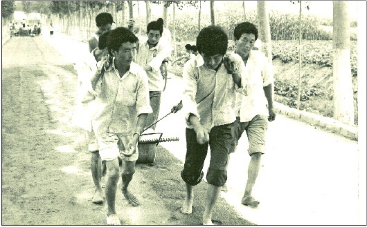 上世纪80年代公路养护人员用石碾子对路面进行碾压。